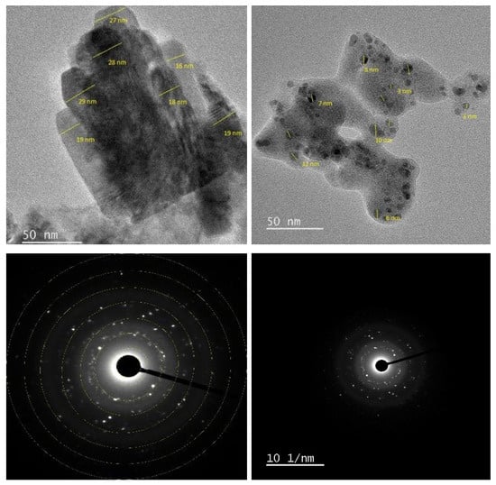 TEM (top) and SAED (bottom) images of ZnO/CuO/Alg NC.