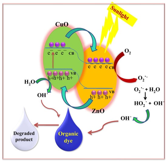 Copper(II) oxide (CuO) is a p-type semiconductor commonly employed to enhance the photocatalytic efficiency of wide band gap materials such as ZnO, TiO2, and SnO2 [45,46]. The CuO/ZnO mixed metal oxide nanomaterial exhibits superior photocatalytic performance compared to either pure ZnO or CuO alone [3,4,30]. This improvement is attributed to the reduced recombination rate of photogenerated electron–hole pairs within the coupled system, resulting in enhanced photocatalytic activity. Coupling semiconductors with compatible band structures, such as ZnO and CuO, not only facilitates charge separation but also extends the photoresponse of ZnO into the visible light region, thereby enabling photocatalytic activity under solar irradiation. Several studies have reported the successful synthesis of CuO/ZnO nanomaterials using environmentally friendly, green methods [3,20,27,46,47].