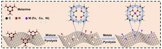 Transition metal single-atom catalysts (SACs) have attracted considerable research interest due to their broad elemental diversity, distinctive electronic properties, and relatively low cost [3,11]. The catalytic performance of SACs is primarily governed by the chemical bonding interactions between isolated metal atoms and the support, as well as the interfacial charge transfer dynamics. Compared to monometallic SACs, binary or ternary SACs exhibit increasingly evident performance advantages. Well-defined metal-support interfaces and intermetallic synergistic effects can significantly enhance catalytic activity and enable multifunctional capabilities [12]. As a representative case, Liu et al. [13] developed a Fe–Cu diatomic catalyst supported on nitrogen-doped porous carbon (FeCu SACs/NC). Compared to the monometallic analogs (Fe SACs/NC and Cu SACs/NC), the bimetallic system displayed improved oxygen reduction performance in acidic electrolyte, manifesting as a positively shifted half-wave potential (0.75 V) and an increased kinetic current density (7.27 mA cm−2). Theoretical calculations verified that copper incorporation enables electronic modulation of the iron centers, effectively lowering the activation barrier for the oxygen reduction reaction. In another study, Da et al. [14] constructed a Pt–Ni bimetallic catalyst anchored on nitrogen-doped carbon (PtNi–NC) through atomic layer deposition. This heteronuclear catalyst exhibited outstanding hydrogen evolution activity in acidic medium, achieving an ultralow overpotential of 30 mV at 10 mA cm−2 with a mass activity 21 times higher than commercial 20 wt% Pt/C, substantially exceeding the performance of its monometallic counterparts. Wan et al. [15] developed a carbon-supported Fe/Co/Ni bimetallic single-atom catalyst (Tan–CN–CoFe/NiFe). The bimetallic system displayed superior OER performance in alkaline media, exhibiting substantially lower overpotentials (down to 320 mV), higher turnover frequencies (up to 5.2 s−1), and reduced Tafel slopes (as low as 58 mV dec−1) relative to their monometallic analogs (Tan–CN–Fe, –Co, or –Ni). Zhang et al. [16] constructed a Pt–Fe–Co ternary single-atom catalyst anchored on nitrogen-doped carbon nanospheres derived from a covalent organic framework. Electrochemical characterization showed that this ternary catalyst achieves a half-wave potential (E1/2) of 0.845 V in alkaline media, outperforming both the monometallic Pt/N–C (0.79 V) and bimetallic Fe,Co/N–C (0.81 V) catalysts. This enhancement is attributed to the synergistic modulation of the Pt D-band center by Fe and Co. While traditional single-atom catalysts possess well-defined active sites and high atom utilization efficiency, their spatially isolated single-site configuration restricts synergistic interactions between adjacent metal sites, leading to insufficient electronic coupling and creating bottlenecks for further enhancing catalytic activity. Therefore, this study investigates FeCoNi-coupled single-atom catalysts, which maintain atomic dispersion while effectively modulating the d-band electronic structure and local coordination environment of active sites. This dual modulation enhances the intrinsic activity of each metal site and optimizes the adsorption behavior of hydrogen/oxygen-containing intermediates during both the HER and OER. Consequently, the rational design of synthesis pathways and optimization of support structures to precisely control the content, atomic-level distribution, and chemical valence states of multiple metallic elements are of paramount importance for developing high-performance non-precious metal catalysts.