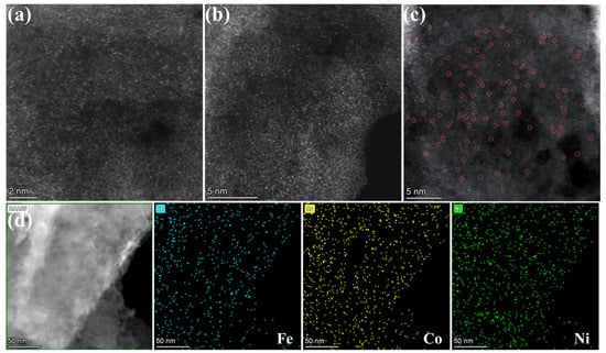 To further examine the spatial distribution of metallic elements, HAADF-STEM was conducted on the Cat-500 sample. Images acquired at 2 nm and 5 nm scales (Figure 5a–c) reveal a high density of bright spots corresponding to isolated metal atoms, providing direct evidence of atomic-level dispersion of Fe, Co, and Ni species. The absence of nanoparticles or metal clusters further corroborates the highly dispersed nature of the metal centers. Elemental mapping (Figure 5d) confirms the uniform spatial distribution of Fe, Co, and Ni across the carbon support.