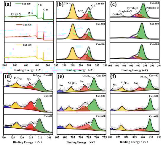 The high-resolution N 1s spectra (Figure 6c) were deconvoluted into four components: pyridinic N (398.4 eV), pyrrolic N (399.6 eV), graphitic N (401.1 eV), and oxidized N (404.3 eV) [28,29,30]. The distribution of nitrogen species is dependent on pyrolysis temperature (Table 3). Cat-500 exhibits the highest pyridinic N content (75.9%), significantly exceeding that of Cat-400 (67.15%) and Cat-600 (68.09%), indicating its superior ability to form metal anchoring sites. In contrast, Cat-600 exhibits the lowest proportion of pyrrolic N (11.36%), indicating that elevated pyrolysis temperatures facilitate the progressive conversion of less stable pyrrolic configurations into more thermally robust pyridinic and graphitic nitrogen species. This thermal transformation effectively enhances the nitrogen coordination environment within the carbon matrix. The high-resolution Fe 2p spectrum (Figure 6d) exclusively presents characteristic peaks corresponding to Fe2+ and Fe3+ oxidation states, with no detectable metallic Fe phase, confirming the successful formation of mixed-valence iron species with coordinated chemical states [31]. Similarly, the Co 2p spectrum (Figure 6e) indicates that cobalt exists in oxidized forms (Co2+ and Co3+) [32], and the Ni 2p spectrum (Figure 6f) confirms the presence of Ni2+ and Ni3+. These findings collectively confirm the atomic dispersion of Fe, Co, and Ni within the nitrogen-doped carbon matrix, stabilized through typical M–N (M = Fe, Co, Ni) coordination environments [33].