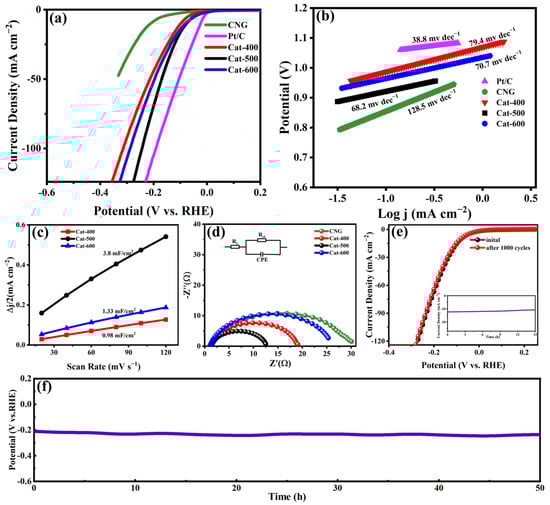Electrocatalytic HER performance of CNG, Cat-400, Cat-500, Cat-600, and Pt/C. (a) LSV polarization curves; (b) Corresponding Tafel plots; (c) Electrochemically active surface areas of the catalysts; (d) Nyquist plots of the catalysts; (e) Polarization curves of Cat-500 before and after 1000 CV cycles. The inset in panel (e) presents the long-term stability test of Cat-500 at a constant current density of 10 mA cm−2; (f) CP response profiles of Cat-500 recorded during the 50 h HER operation.