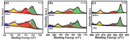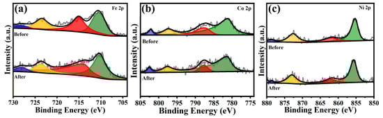 XPS of Cat-500 before and after HER stability testing: (a) Fe 2p, (b) Co 2p, and (c) Ni 2p.