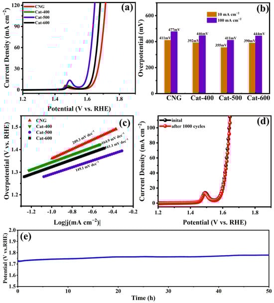 Electrocatalytic OER performance of CNG, Cat-400, Cat-500, and Cat-600. (a) LSV polarization curves; (b) Overpotentials at representative current densities; (c) Corresponding Tafel plots; (d) Polarization curves of the Cat-500 electrocatalyst before and after 1000 CV cycles; (e) CP response profiles of Cat-500 recorded during the 50 h OER operation.
