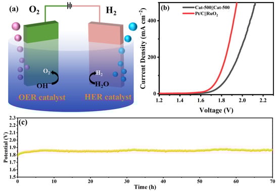 Test for Overall Water Splitting: (a) schematic illustration of overall water splitting using the Cat-500 catalyst, (b) polarization curves for overall water splitting, and (c) CP stability test under 10 mA cm−2.