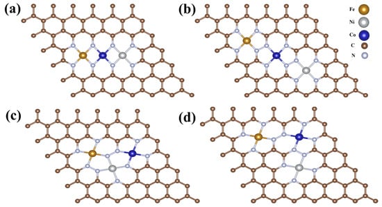 Beyond experimental characterization, the geometric and electronic structure of the FeCoNi-CNG catalyst was investigated through theoretical analysis. The Fe, Co, and Ni atoms are preferentially anchored at nitrogen-induced topological defect sites, forming stable M–N4 coordination structures [44]. First, variations in atomic radii lead to distinct metal-nitrogen bond lengths in the synthesized catalysts. As shown in Figure 13, within the M–N4 configuration, the Fe–N bond length (1.90 Å) [45] is shorter than both Co–N (1.96 Å) [46] and Ni–N (1.95 Å) [47]. This bond-length variation directly influences the coordination symmetry of the metal centers [48] and alters the lattice parameters of the carbon framework. Such structural distortion disrupts the integrity of the sp2-hybridized carbon network, thereby modulating the electronic structure and transforming these defect sites into catalytically active centers. Second, differences in electronegativity among the constituent elements induce significant electron redistribution. Electrons not only transfer from Fe (electronegativity: 1.83) and Co (1.88) to Ni (1.91), but also from the metal atoms to the carbon support. This results in reduced electron density in the d-orbitals of the metal centers. Consequently, the 1s orbital of hydrogen preferentially interacts with these electron-deficient metal d-orbitals, optimizing the hydrogen adsorption free energy [49]. The efficient charge transfer among Fe, Co, and Ni establishes strong electronic coupling within the FeCoNi/CNG catalyst. This interaction effectively modulates the d-electron configuration and promotes charge redistribution at the metal centers, enhancing overall charge transfer efficiency. As a result, the catalyst promotes the adsorption of hydrogen- and oxygen-containing radical intermediates in both the HER and OER. The synergistic effects among the multimetallic active sites collectively enhance the catalytic performance for both reactions [50].