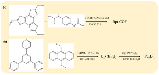 (a) Synthesis scheme 1 of Btp-COF []. (b) Synthesis scheme 2 of Pd6L23 [].