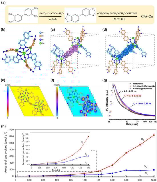 (a) Synthesis scheme 3 of CFA-Zn. (b) The [Zn5 × 4(L)6] SBU in the CFA-Zn structure viewed along the c axis with X and hydrogen atoms omitted for clarity. Spatial distribution profiles of the VBM (c) and CBM (d) in the excited state in the MOF single cell at an isosurface value of 0.003 e Å−3. Purple bubbles and dark blue bubbles represent the electron clouds. (e) Spatial distribution of the VBM and (f) CBM on the (001) facet of CFA-Zn. Charge density (in arbitrary units) is represented by the colour bar. Key: carbon (orange), nitrogen (blue), zinc (green). (g) Fluorescence lifetime decay curves for CFA-Zn in various solvents, monitored at an emission wavelength of 430 nm under excitation at 373 nm. (h) Photocatalytic OWS activity over Pt/CFA-Zn/Co3O4 under visible-light irradiation. Inset: enlargement of the induction period. Reprinted from [], reproduced with permission from Springer Nature.