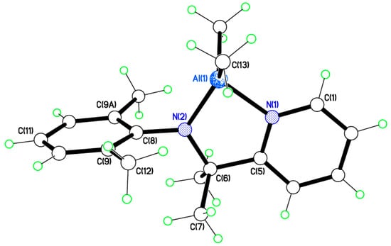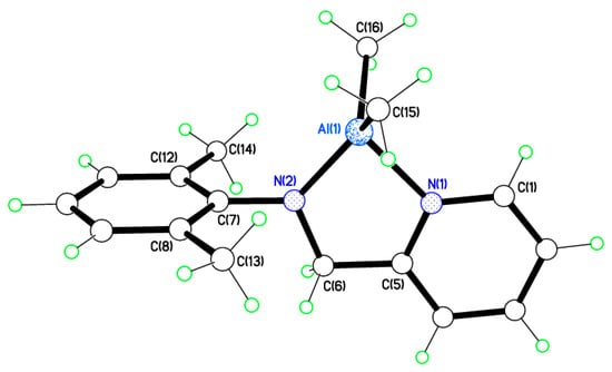 In the case of 2, crystals suitable for X-ray diffraction were again grown from acetonitrile at 0 °C. A view of the molecular structure is shown in Figure 5, with selected bond lengths and angles given in the caption. The presence of the extra methyl groups on the chelate backbone again led to the formation of a structure with one chelate bound to an AlMe2 motif. We note that other studies have shown that changing the bulk of nitrogen-bound substituents in alkyl-2-pyridinamine diethyl aluminium complexes allows for monomer, dimer, or trimer formation []. Half of the molecule of 2 is unique. The atoms Al(1), N(1), C(1) > C(6), N(2), C(8) and C(11) are positioned on a mirror plane. The xylene group on N(2) is perpendicular to the pyridyl moiety of the chelating ligand to avoid Me group steric clashes.