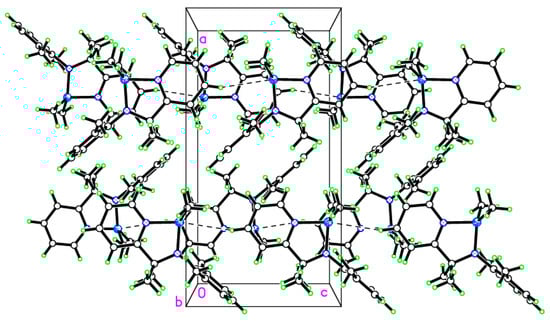 In the packing (Figure 6), there is a weak H-bonding interaction from C(3)–H(3)···Al(1′) = 3.13 Å {symm. operator ′ = x, y, z + 1}, and this does seem to have pushed the Me groups on Al(1) slightly towards N(1) {See Figure S5 in the Supplementary Materials}. Molecules are arranged in anti-parallel stacks {See Figure 5 and Figure S6}.