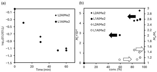 As shown in Figure 8a, the monomer consumption rate showed first order dependence toward the monomer concentration, expressed as [CL], suggesting that these ROPs by 1–3 proceeded without catalyst decomposition. Moreover, linear relationships between Mn values in the resultant polymer vs. polymer yield (conversion of CL) were demonstrated in Figure 8b, whereas the PDI (Mw/Mn) values were low in all cases, strongly suggesting that the ROPs proceeded in a living manner.