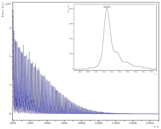 PVL obtained from run 26 (Table 2). The main family is chain polymer terminated by OH and BnO end groups); [M = 107.13 (OBn) + 1.008 (H) + n × 100.11 (VL) + 22.99 (Na)] (e.g., for n = 70, calc. 7114.1, obsv. 7114.1).