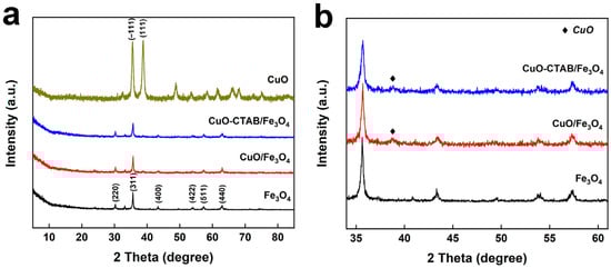 The crystalline phases of the synthesized samples were characterized by X-ray diffraction (XRD). As shown in Figure 1a, the pattern of Fe3O4 exhibits distinct diffraction peaks at 2θ = 30.2°, 35.6°, 43.3°, 54.7°, 57.3°, and 62.9°, which could be ascribed to the (220), (311), (400), (422), (511), and (440) planes of cubic Fe3O4 (JCPDS 72-2303), respectively []. For the synthesized CuO sample, two traditional diffraction peaks at 2θ = 35.5° and 38.7° were labeled as the (−111) and (111) lattice planes of CuO, respectively []. With the loading of copper oxide onto Fe3O4 support, a tiny diffraction peak located at 38.7° belonging to the (111) lattice planes of CuO appeared on the CuO-CTAB/Fe3O4 and CuO/Fe3O4 samples, meaning that the CuO was successfully loaded on the Fe3O4 support (Figure 1b). Moreover, the CuO-CTAB/Fe3O4 and CuO/Fe3O4 samples maintained the diffraction peaks of the Fe3O4 supporter, indicating that the loading process has a negligible impact on its crystalline structure.