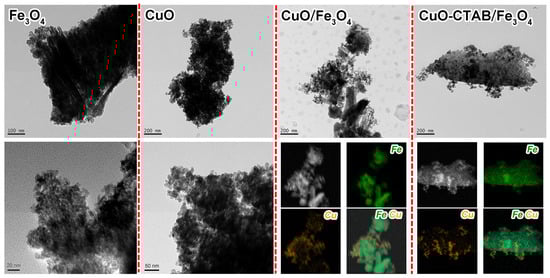The morphology of the synthesized samples was investigated by transmission electron microscopy (TEM). As seen in Figure 3, the Fe3O4 sample revealed an irregular rod-shaped morphology. The high-resolution TEM imaging showed that these rod-shaped structures were composed of dense nanoparticles with an average diameter of 5.5 nm (Table 1, Figure S1). The CuO sample exhibited smaller irregular spherical particles, and the average diameter of these particles was 16.0 nm. It is worth noting that in both Fe3O4 and CuO samples, abundant interparticle voids can be clearly observed, which might lead to the formation of mesoporous structures. High-angle annular dark field-scanning transmission electron microscopy (HAADF-STEM) analysis confirmed the successful loading of CuO particles onto the Fe3O4 carrier in both CuO/Fe3O4 and CuO-CTAB/Fe3O4 samples. Inductively coupled plasma-optical emission spectrometry (ICP-OES) results further demonstrated that the actual CuO content in these samples closely matched the theoretical values (Table 1). Notably, the average diameters of CuO particles in CuO/Fe3O4 and CuO-CTAB/Fe3O4 samples were 14.7 nm and 13.1 nm, respectively, smaller than that of the pure CuO sample (Figure 4a,b). This phenomenon indicates that the presence of Fe3O4 supporter could help to alleviate the sintering of CuO particles in the roasting process. Moreover, in the CuO-CTAB/Fe3O4 sample, the addition of CTAB further improved the dispersion of active components on the carrier, contributing to an even smaller CuO particle size [].