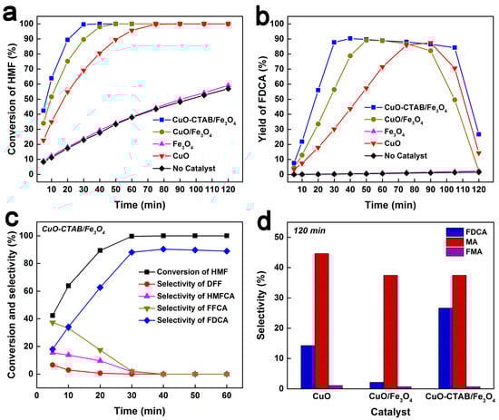 The catalytic performance of the catalysts was evaluated for the oxidation of HMF to FDCA. As shown in Figure 5a,b, in the absence of a catalyst, HMF conversion increased slowly, and no significant FDCA yield was detected throughout the reaction, suggesting that NaClO alone was insufficient in catalytic oxidation of HMF to FDCA. When Fe3O4 was used as the catalyst, both the curves of HMF conversion and FDCA yield profiles remained similar to those without any catalyst, implying a negligible catalytic role of Fe3O4 in this reaction. In contrast, the CuO catalyst enabled a gradual increase in HMF conversion to 100% within 75 min, accompanied by a slow rise in FDCA yield to 87.5% at 90 min, demonstrating its effectiveness in catalytic oxidation of HMF to FDCA. Notably, both CuO-CTAB/Fe3O4 and CuO/Fe3O4 catalysts exhibited superior activity, achieving the complete conversion of HMF at 30 min and 50 min, respectively. Furthermore, the FDCA yield over CuO-CTAB/Fe3O4 rapidly reached 90.3% within the first 40 min, while the maximum yield over CuO/Fe3O4 was 89.1% at 50 min, confirming the high efficiency of these catalysts in promoting HMF oxidation to FDCA. Our previous work had observed that both the HMF conversion rate and the FDCA formation rate decreased progressively as the particle size of nano copper oxide increased []. In the present work, the CuO particle size followed the order: CuO > CuO/Fe3O4 > CuO-CTAB/Fe3O4. Therefore, the superior catalytic performance of CuO-CTAB/Fe3O4 can reasonably be attributed to its smallest CuO particle size. Notably, a significant decline in FDCA yield was observed during the later stage of the reaction, suggesting that FDCA was unstable in the current reaction system. Analysis of the reaction solution at 120 min (Figure 5d) revealed the presence of substantial maleic acid (MA) along with trace amounts of fumaric acid (FMA), indicating that FDCA could be further converted to MA, FMA, and other unidentified products.
