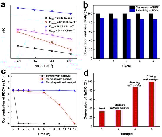 Apparent activation energies of different reactants on the CuO-CTAB/Fe3O4 catalyst (a), stability test of CuO-CTAB/Fe3O4 catalyst (b), concentration variations of FDCA (c), and conversion of NaClO (d) in the samples stored under different conditions.