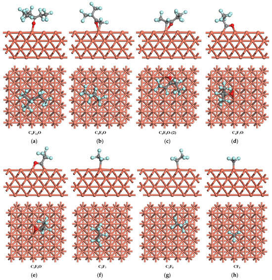 Four typical adsorption sites (top, hole, short bridge, and long bridge) on the Cu (1 1 0) surface are considered for C6F12O and the decomposition products. The most stable adsorption states and the corresponding adsorption energies, configurations, and key bond length for each species absorbed on the Cu (1 1 0) surface are listed in Table 2. The most stable adsorption structures of C6F12O and the relevant products on the Cu (1 1 0) surface are shown in Figure 2.
