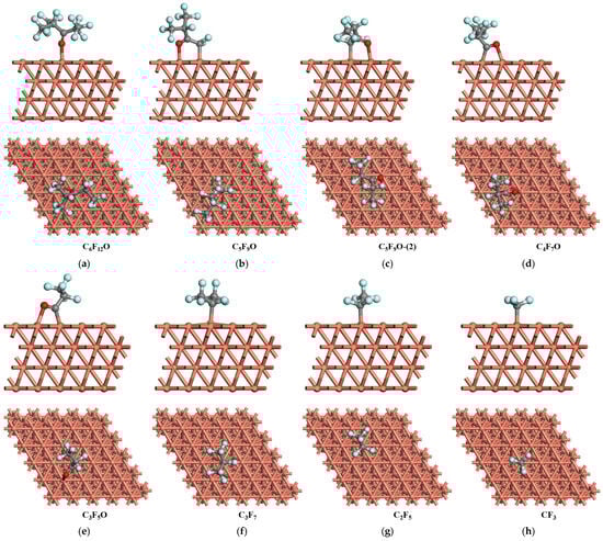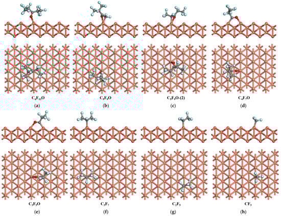 Four typical adsorption sites (top, bridge, hcp, and fcc) on the Cu (1 1 1) surface are considered for C6F12O and its decomposition products. The most stable adsorption states and the corresponding adsorption energies, configurations, and key bond length for each species absorbed on the Cu (1 1 1) surface are listed in Table 3. The most stable adsorption structures of C6F12O and the relevant products on the Cu (1 1 1) surface are shown in Figure 3.
