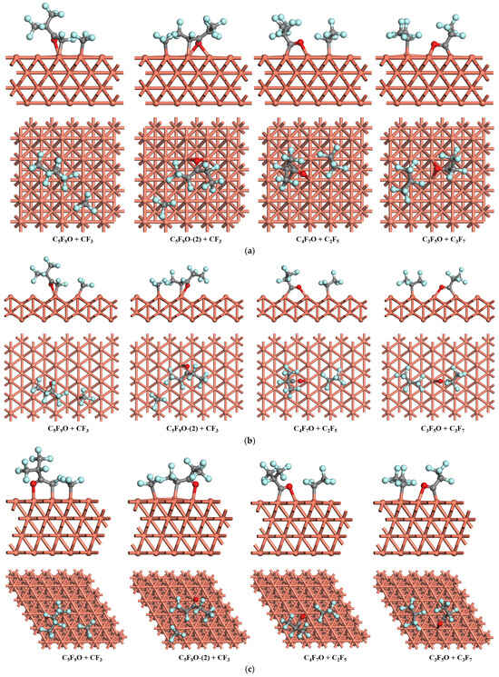 Considering the initial co-adsorption structures in the geometry optimization calculations, the corresponding dissociation species are placed adjacently and at the most stable adsorption site on the Cu (1 0 0), Cu (1 1 0), and Cu (1 1 1) surfaces [,]. For example, for the co-adsorption of C5F9O + CF3 on the Cu (1 0 0) surface, the initial structure is that C5F9O is placed on the top site and CF3 on the adjacent top site according to the calculation results before.