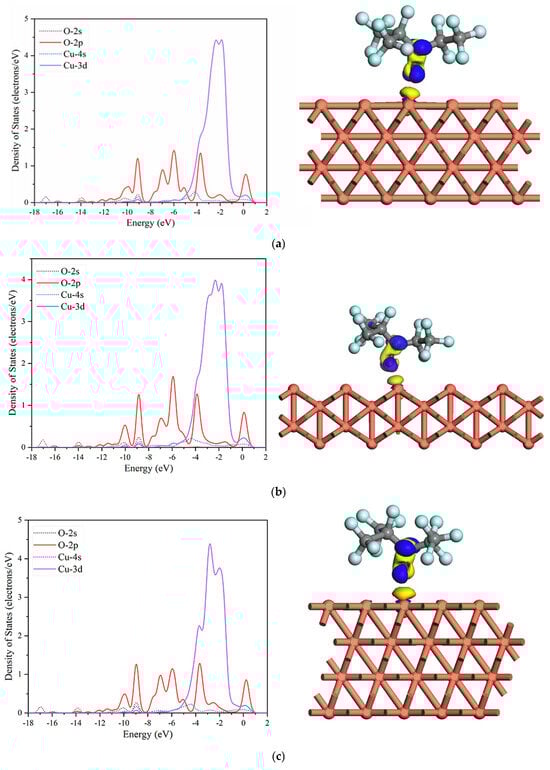 PDOS and charge density difference isosurfaces of the most stable adsorption structures of C6F12O (the blue and yellow regions represent positive and negative values) in 0.03 isovalue: (a) Cu (1 0 0), (b) Cu (1 1 0), and (c) Cu (1 1 1).