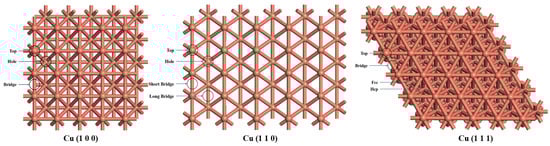 The Cu bulk structure is optimized first and the Cu lattice parameter is 3.61 Å, which is correlated with the experiment result of 3.62 Å [], showing the reliability of the computational method. Considering the balance between the accuracy and computational cost, the Cu (1 0 0), Cu (1 1 0), and Cu (1 1 1) surfaces are modeled with a (5 × 5) supercell with a four-layer plate (100 Cu atoms in a cell) compared with the previous studies [,]. The vacuum layer of 20 Å is added between the plates to avoid the periodic interactions. Moreover, the atoms of the bottom two layers are fixed while the upper two layers are relaxed. There are three adsorption sites of the Cu (1 0 0) surface, the top, bridge, and hole; four adsorption sites of the Cu (1 1 0) surface, the top, long bridge, short bridge, and hole; and four adsorption sites of the Cu (1 1 1) surface, the top, bridge, hcp, and fcc, as shown in Figure 9. The adsorption energy () for the substances adsorbed on the Cu surfaces are calculated as follows:
