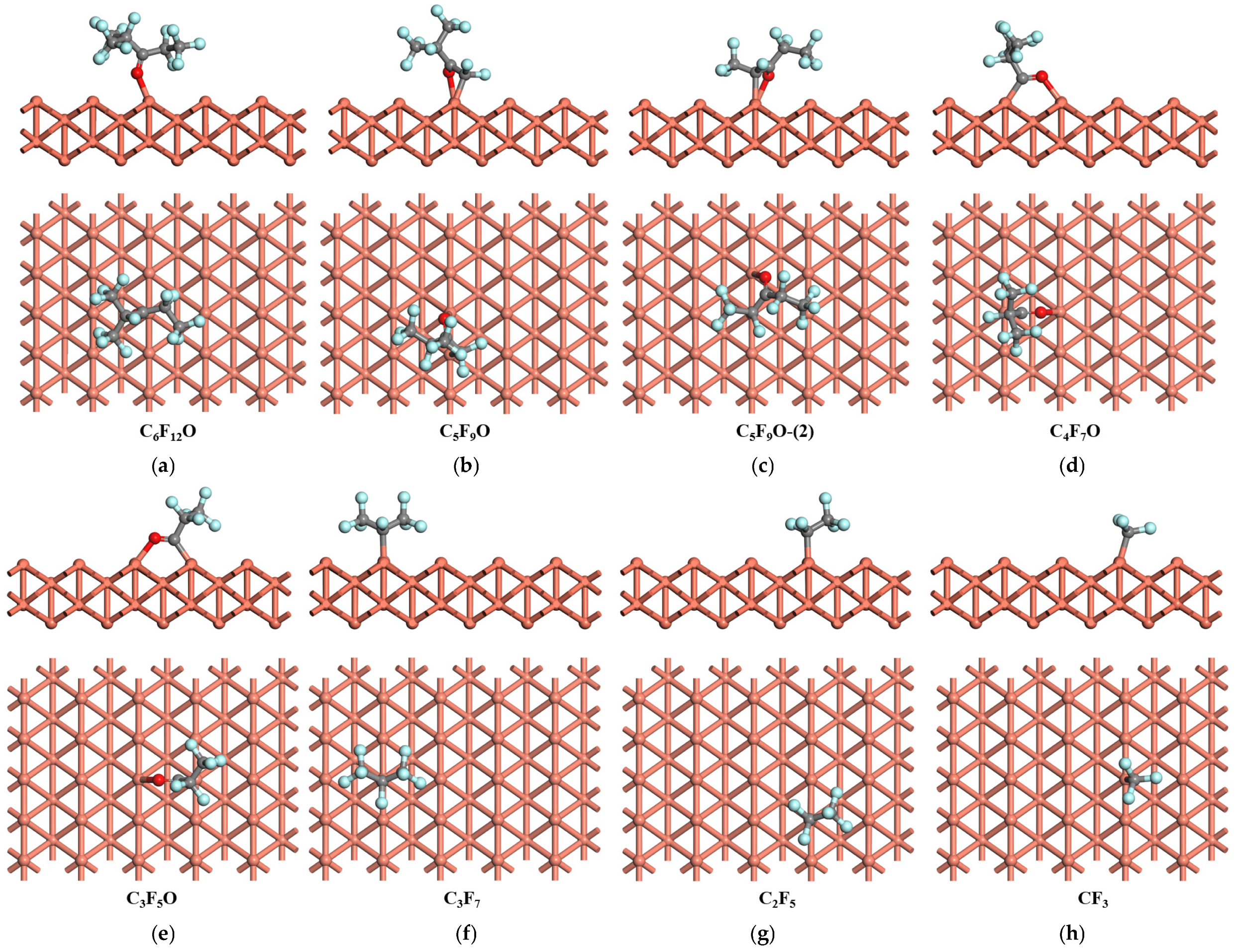 - Zhang, B.; Zhang, Z.; Xiong, J.; Yang, T.; Li, X.; Chen, L.; Li, C.; Deng, Y. Thermal and electrical decomposition products of C5F10O and their compatibility with Cu (1 1 1) and Al (1 1 1) surfaces. Appl. Surf. Sci. 2020, 513, 145882. [Google Scholar] [CrossRef]