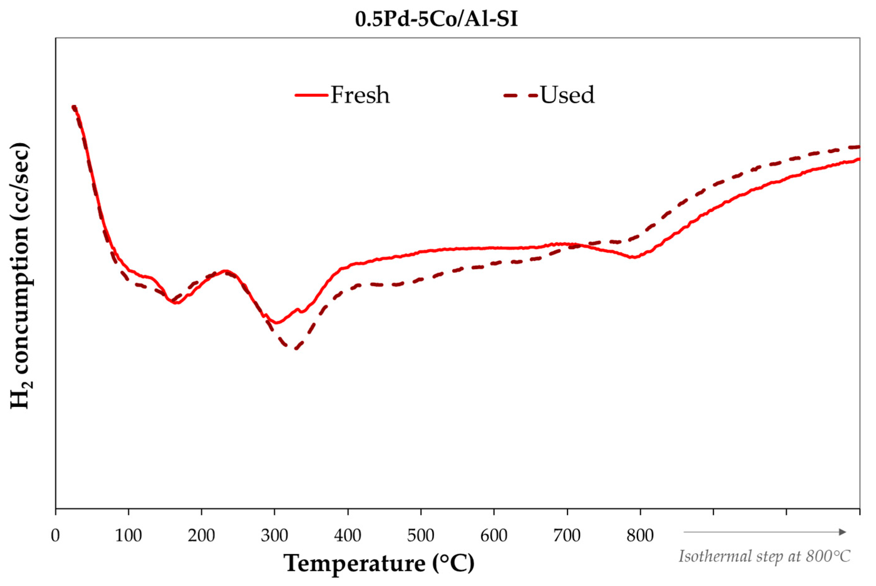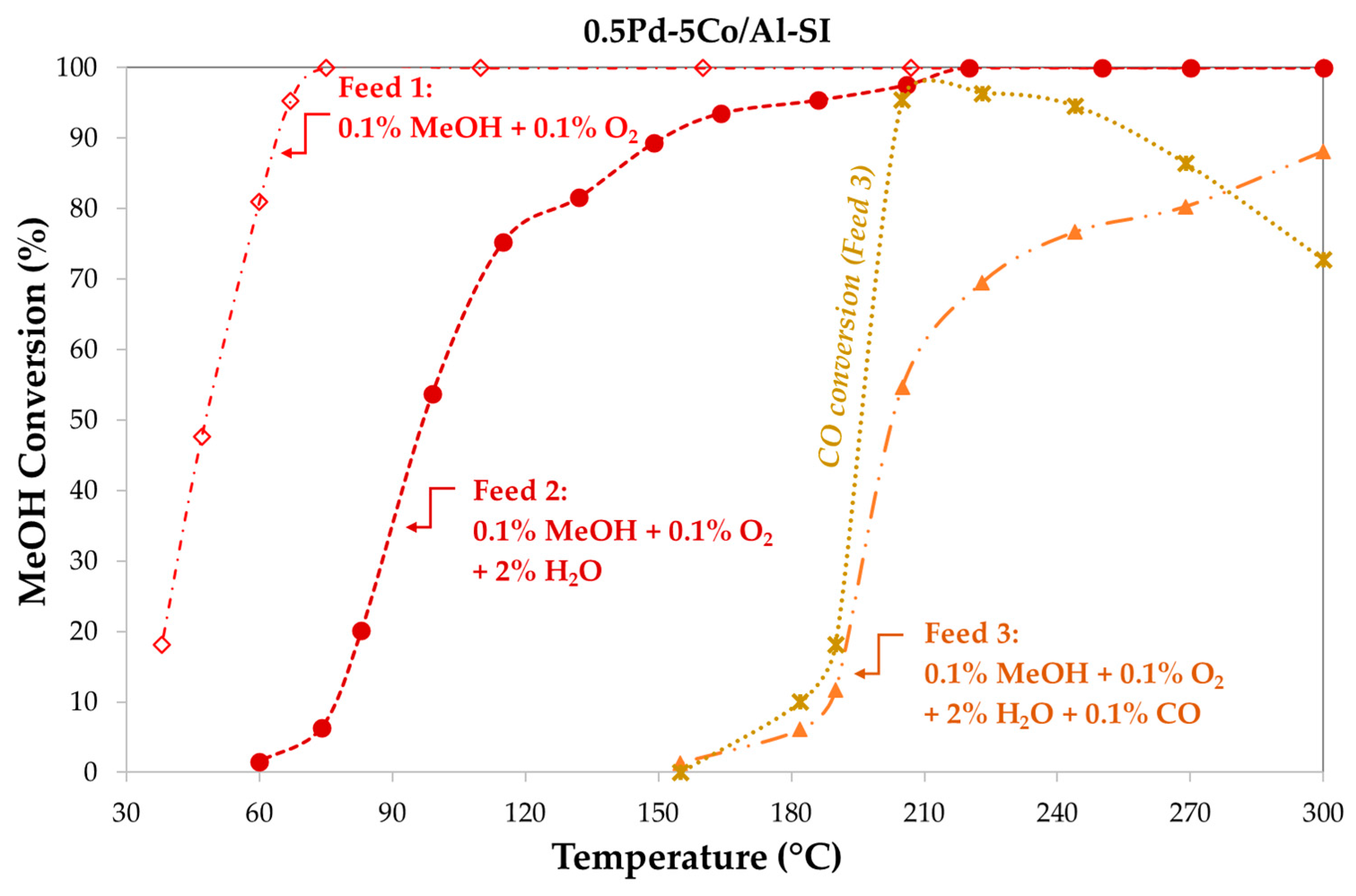 2.4.1. Effect of CO and/or H2O on Optimum 0.5Pd-5Co/Al-SI Catalyst Activity