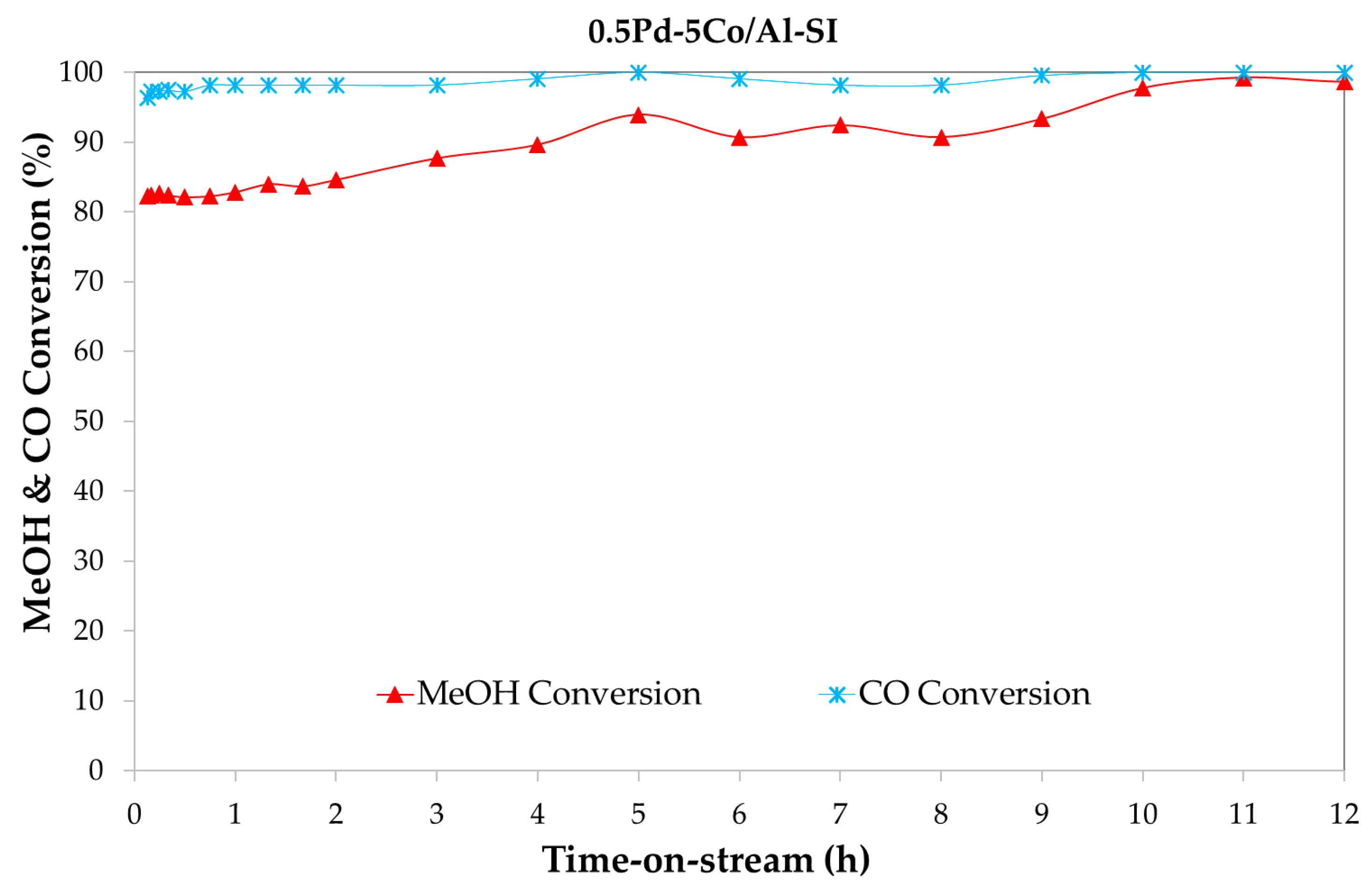 2.4. Effect of Impurities (H2O and CO) and Catalysts Stability with Time-on-Stream