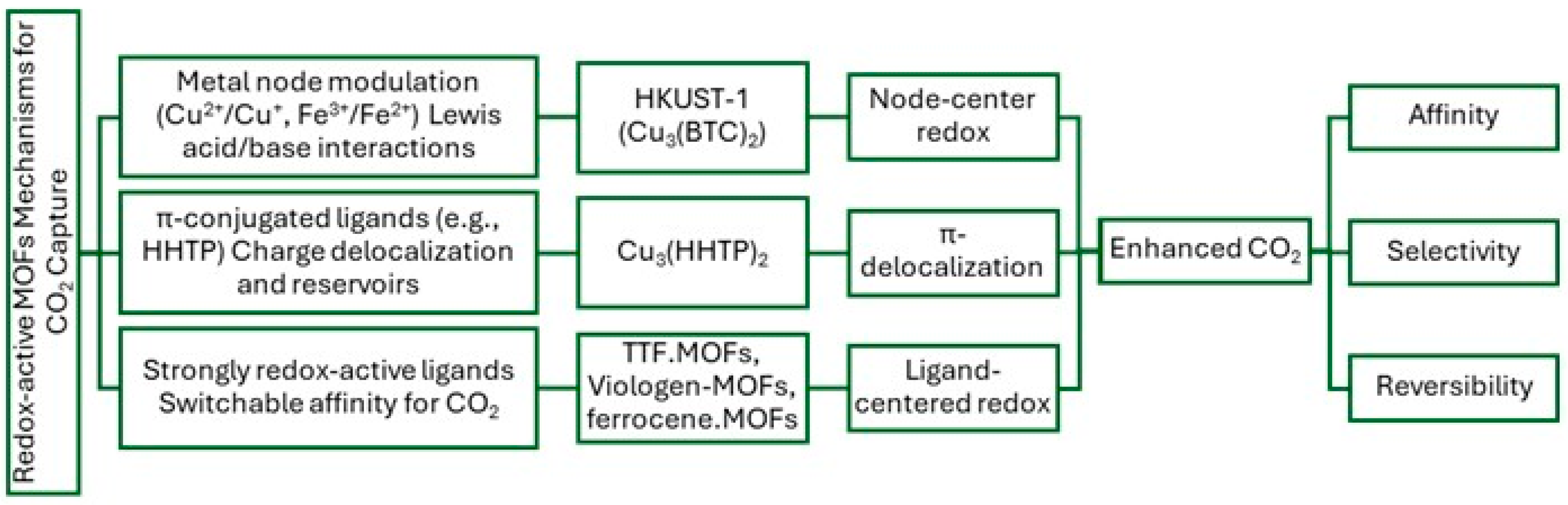 | HKUST-1 (Cu) | Cu2+/Cu+ at carboxylate nodes | Lewis affinity modulation with CO2 | [106] |
