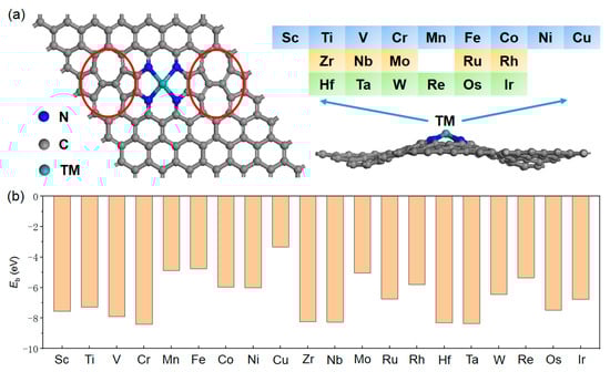 (a) Schematic diagram of the optimized TM-N4-C57 catalyst structures. The red circles indicate the location of the topological defects. (b) The corresponding binding energies (Eb) of transition metal atoms anchored on topological defective graphene substrate N4-C57.