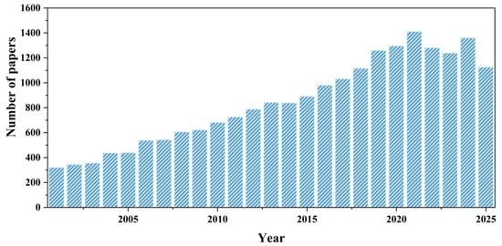 The number of literature sources related to wastewater treatment by plasma from 2001 to 2025 (data from ‘Web of Science’).