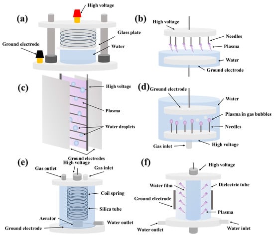 Common plasma reactor structures: (a) plate–plate reactor; (b) needle array–plate reactor; (c) corona with water shower reactor; (d) corona in bubbles reactor; (e) tube–tube reactor; (f) falling liquid film reactor.