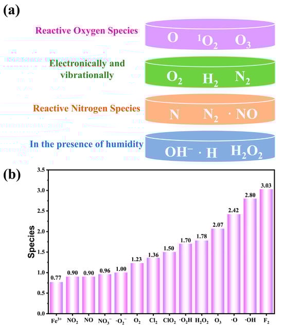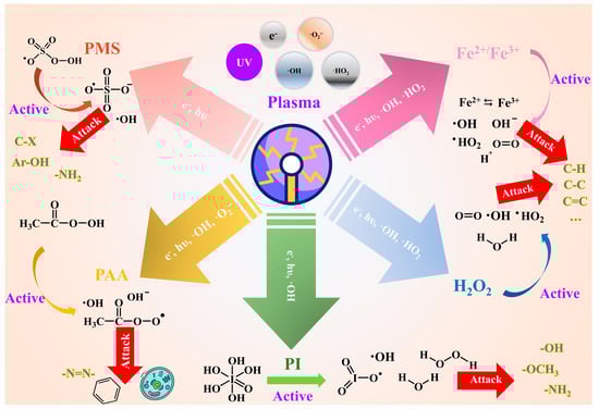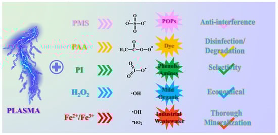 In this context, plasma technology has surfaced as a formidable and versatile advanced oxidation platform [6]. As a partially ionized gas, plasma serves as a rich source of diverse reactive species, including high-energy electrons, ions, excited atoms/molecules, radicals (e.g., ·OH, ·H), and molecular agents (e.g., H2O2, O3) [7,8,9]. Upon interaction with aqueous solutions, these plasma-generated species initiate a complex suite of physiochemical processes directly in the liquid phase or at the gas–liquid interface, enabling the direct degradation of a wide spectrum of organic pollutants [10]. Unlike conventional single-mode activation methods, plasma provides a unique multi-component ‘reactive species library’ and an energetic field, establishing a versatile foundation for water decontamination [11]. Despite these advantages, the practical application of plasma-alone systems is hampered by inherent limitations, such as relatively low energy efficiency, where a significant portion of electrical energy is dissipated as heat, and poor reaction selectivity, which can lead to incomplete mineralization and the formation of toxic by-products [12]. These bottlenecks underscore the need to enhance the efficacy and sustainability of plasma-based water treatment.