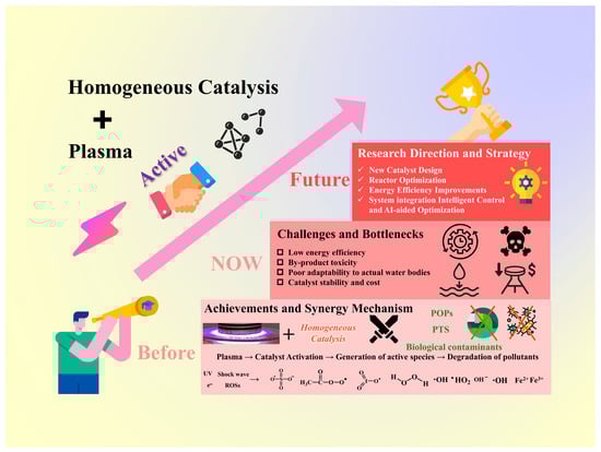 The pervasive contamination of water bodies by refractory organic pollutants necessitates the development of advanced purification technologies. Plasma has emerged as a promising solution, capable of generating a broad spectrum of reactive oxygen and nitrogen species (RONS), UV photons, and electrons in situ, thereby directly degrading contaminants. However, the practical application of plasma-alone systems is often constrained by limited energy efficiency and insufficient mineralization capacity. To overcome these challenges, the integration of plasma with homogeneous advanced oxidation processes (AOPs) has been established as a highly effective strategy. By coupling plasma with catalysts such as peroxymonosulfate (PMS), peracetic acid (PAA), periodate (PI), and Fenton reagents (Fe2+/Fe3+), a remarkable synergistic effect is achieved. This synergy arises from the multi-modal activation of catalysts by plasma via energetic electrons, UV photolysis, and radical-induced reactions, while the catalysts, in turn, consume long-lived plasma products and regulate reaction pathways. The resultant ‘plasma/catalytic’ system significantly enhances the degradation rate and mineralization efficiency of pollutants, broadens the operational pH window, and improves overall energy utilization. This review systematically examines the mechanisms, performance, and influencing factors of these hybrid systems, and discusses current challenges and future prospects to guide the development of this synergistic technology for sustainable water remediation.