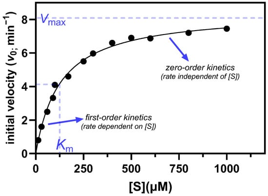 A typical Michaelis–Menten plot showing the graphical meaning of kinetic parameters from a steady-state kinetic analysis and the regions of first-order and zero-order kinetics with respect to substrate concentration [S].