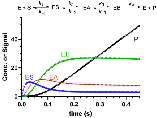 Progress curves of a simulated hypothetical enzymatic reaction, according to the mechanism given above the graph. The simulation was carried out using the following input parameters: k1 = 0.1 µM−1s−1, k−1 = 10 s−1, k2 = 45 s−1, k−2 = 1 s−1, k3 = 30 s−1, k−3 = 4 s−1, k4 = 5 s−1; [E] = 50 µM; [S] = 200 µM. The response factors of each species have been assumed to be equal. In a real case, signals can be measured for each species separately using a different technique and can be converted to concentrations using response factors (e.g., extinction coefficients). The simulation has been performed with the program DynaFit [47].