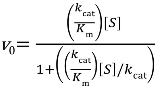 Vmax/Km (or kcat/Km) is most commonly known as “specificity constant” or “catalytic efficiency” (other terms have also been suggested [18]) and encompasses two parameters in a single term. It is a measure of the preference of an enzyme towards its substrate, thus useful in comparing different enzymes (e.g., mutant variants) for the same substrate or the same enzyme for different substrates, although care must be taken in the former case, as has been discussed in reference [19]. It has been argued in the literature that kcat and kcat/Km should be regarded as the main kinetic parameters that can be obtained from a steady-state analysis, and Km should be considered as just a ratio of kcat and kcat/Km [16,17,18]. kcat/Km represents the apparent second-order rate constant for (productive) binding of the substrate to the enzyme to form an ES complex (it approaches a true second-order rate constant if collapse of the ES complex to P is much faster than its reverse reaction to E and S) [17]. Calculation of kcat/Km (or Vmax/Km) can be performed in different ways. One can simply derive kcat and Km from non-linear regression of the initial velocity data using Michaelis–Menten equation and take the ratio of the two parameters. That will require error propagation to report the error estimates on kcat/Km, which can lead to large standard errors (since both parameters, kcat and Km, are calculated from extrapolations to an infinite substrate concentration that is never reached). However, the Michaelis–Menten equation can also be rearranged to directly involve the term kcat/Km (Scheme 3) so that non-linear regression directly gives this term, often with lower error estimates, as has been demonstrated by Johnson [17]. Overall, whether kcat/Km or kcat or Km is a better parameter for comparing enzymes depends on the purpose and application. Since most biocatalytic application areas of enzymes require saturating high concentrations of the substrates (for a feasible synthesis), kcat can be a better term to use in comparing enzymes for their application potential. However, in the study of enzyme mechanisms and for in vivo studies, kcat/Km can be a better parameter. Since kcat/Km is affected by all the initial steps up to and including the first irreversible step of the enzymatic reaction, evaluating the effect of different substrates, isotope exchange and medium viscosity on kcat/Km gives valuable mechanistic information on these initial steps [20,21,22,23].