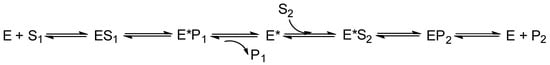 Moreover, the order of substrate binding and product release steps in multi-substrate enzymatic reactions can be deduced from steady-state kinetic analysis, as has been shown by the work of Cleland in the 1960s [2,33,34,35]. In a two-substrate enzymatic reaction (with S1 and S2 as the two substrates) a sequential (random or ordered) vs. a ping-pong mechanism can easily be distinguished by a double-reciprocal plot (1/v vs. 1[S1]) obtained at multiple fixed concentrations of S2; a series of parallel lines indicates a ping-pong mechanism, whereas intersecting lines point to a sequential mechanism (Scheme 5 and Scheme 6).