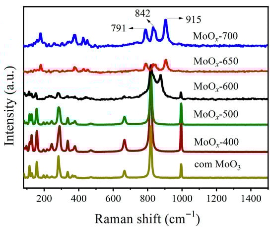 As an efficient characterization strategy to detect slight vibration changes associated with the emergence of phase transitions and defects, Raman spectra of MoOx calcined at different temperatures and commercially available MoO3 (com MoO3) were conducted (Figure 1). Initially, for com MoO3, the asymmetric stretching of Mo=O (va(Mo=O)) around 997 cm−1 could be viewed. Then, stretching vibrations viewed at 823 and 667 cm−1 could be attributed to v(Mo2–O) and v(Mo3–O), respectively. In addition, the characteristic peaks in the range of 150–400 cm−1 could be ascribed to bending, wagging, and twisting vibrations [35]. For MoOx calcined at 400 °C and 500 °C, similar Raman spectra could be detected, indicating the generation of a basic MoO3 lattice framework. For MoOx calcined at higher temperatures, the prominent peaks at 997, 823, and 667 cm−1 disappeared. Simultaneously, three new peaks at 791, 842, and 915 cm−1 were observed, which can be ascribed to the stretching vibrations of the bridging oxygen bonds in MoOx-700 [36,37]. Generally, the appearance or disappearance of peaks, variations in peak intensity, and shifts in peak position in the Raman spectra indicate variations in chemical bonding. In this study, the changes in the Raman spectra might be attributed to the generation of oxygen vacancies.