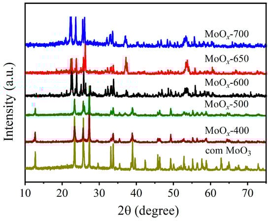 Then, X-ray diffraction (XRD) measurements were conducted to determine the lattice changes of MoOx during the calcination procedure (Figure 2). For com MoO3, its orthorhombic phase was clearly identified (JCPDS card: 76-1003), exhibiting lattice constants of a = 3.962 Å, b = 13.855 Å, and c = 3.699 Å [38]. For MoOx calcined at lower temperatures, similar diffraction peaks could be observed, with no other phases detected, indicating the generation of the orthorhombic MoO3 lattice framework at these temperatures. For the MoOx calcined at higher temperatures, the generation of MoOx containing both a monoclinic phase (JCPDS card: 78-1073) and an orthorhombic phase (JCPDS card: 72-0448) was observed [39]. The formation of mixed crystal phases is conducive to the generation of oxygen vacancies.