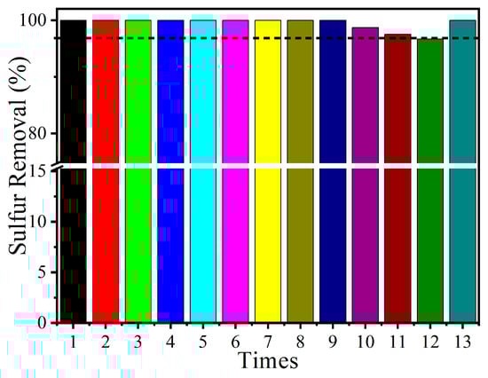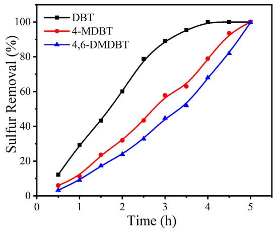 Considering the presence of various refractory sulfides in fuel oils, the sulfur removal of different sulfides needs to be investigated using MoOx-700 as catalyst under the same reaction conditions (Figure 7). Here, DBT, 4-methyl-dibenzothiophene (4-MDBT), and 4,6-dimethyl-dibenzothiophene (4,6-DMDBT) were selected as representative sulfur compounds owing to their known difficulty in traditional desulfurization procedure. In this reaction system, sulfur removal decreased in the order of DBT > 4-MDBT > 4,6-DMDBT. After reaction for 4 h, sulfur removals of 92.8% and 90.5% were achieved for 4-MDBT and 4,6-DMDBT, respectively. The reactivity of sulfides is often influenced by both the electron cloud density on S atoms and the steric hindrance effect, the latter of which affects the efficient contact between S atoms and reactive oxygen species. For these sulfides, the electron cloud densities on the S atoms are 5.758, 5.759, and 5.760 for DBT, 4-MDBT, and 4,6-DMDBT, respectively, showing only slight differences among them [55]. Thus, the presence of additional methyl groups in 4-MDBT and 4,6-DMDBT would be responsible for the decrease in sulfur removal [56]. However, by continuously prolonging the reaction time to 5 h, complete removal of sulfides was also achieved for both 4-MDBT and 4,6-DMDBT, which might be attributed to the continuously supplied oxidant from air. Compared to ODS processes using H2O2 or TBHP as the oxidant, the oxidant employed in this work can be supplied continuously at negligible cost and with a lower risk of explosion [57], implying its potential suitability for practical applications.