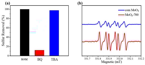 To identify the types of reactive oxygen species generated during the desulfurization process, radical quenching experiments were performed (Figure 9a). Here, p-benzoquinone (BQ) and tert-butanol (TBA) were employed as radical scavengers for O2−• and •OH, respectively [58]. When BQ was introduced into the model oil, the sulfur removal sharply decreased to 12.3%. In contrast, no significant decrease in sulfur removal was observed upon the addition of TBA. The above results illustrate that O2−• would be the dominant radicals generated during the desulfurization procedure. To further confirm the above conclusion, ESR measurements were carried out (Figure 9b), in which 5,5-dimethyl-1-pyrroline N-oxide (DMPO) was used as a radical scavenger. For MoOx-700, a typical strong signal of DMPO-O2−• with six peaks could be observed, indicating the abundant generation of O2−• during the desulfurization process [59]. In addition, for com MoO3, a typical DMPO-O2−• signal could also be identified, but it exhibited a significantly weaker intensity, which is consistent with its sharply decreased catalytic oxidation performance. Taking the above together, we can speculate that the refractory DBT in the oil phase is first oxidized to sulfoxide and then ultimately to polar sulfone. The generated sulfone is subsequently precipitated on the surface of the catalyst due to its obviously changed polarity, realizing the efficient removal of sulfide from the oil phase.