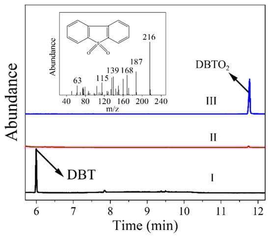 To confirm the successful oxidation of DBT to DBTO2 and the spontaneous separation of sulfone from the oil phase, gas chromatography–mass spectrometry (GC-MS) was employed to analyze the sulfide species in the fresh oil phase, the oxidized oil phase, and the extract solution of the reacted catalyst phase (Figure 10). Initially, the prominent peak observed in the fresh oil phase corresponds to DBT, which disappears in the oxidized oil phase, indicating the successful oxidation of DBT in this desulfurization system. Meanwhile, a distinct peak is observed in the extract solution of the reacted catalyst phase, whose m/z value is 216, corresponding to the oxidized DBTO2 [60]. However, this peak is negligible in the oxidized oil phase. Thus, based on the above experimental observations, DBT present in the oil phase was oxidized by the generated O2−• to DBTO2 with strong polarity, which subsequently precipitated on the surface of the catalyst, achieving the successful removal of sulfide from the oil phase finally.