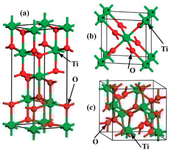 Three common crystalline forms of TiO2: (a) anatase, (b) rutile, (c) brookite [70].