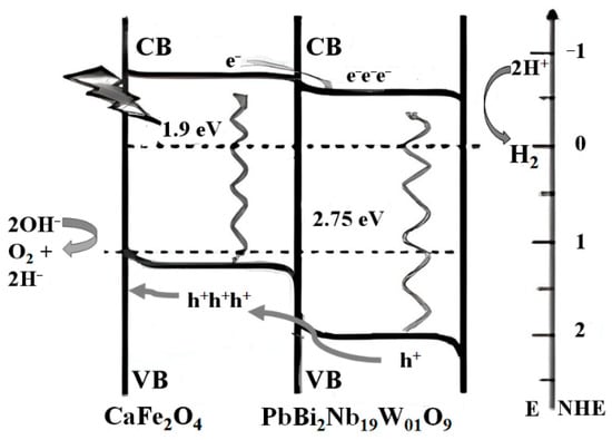 The Gibbs free energy for the water-splitting reaction is equal to 273 kJ.mol−1, categorizing it as a non-spontaneous reaction. Photoelectrolysis of water, which uses a semiconductor photocatalyst to produce oxygen and hydrogen, is a promising method for converting solar energy into carbon-free, clean H2 fuel. Typically, photoelectrocatalysis involves three main steps: (1) light absorption by a semiconductor, resulting in the formation of holes in the VB and electrons in the CB; (2) charge separation and migration to the surface; and (3) evolution of O2 or H2 at the electrodes. The efficiency of photoelectrolysis depends on the kinetics of these steps and the thermodynamic equilibrium [52,53,54,55]. In a typical photoelectrocatalytic assembly, photons with sufficient energy (hν ≥ band gap, Eg) can excite electron–hole pairs capable of overcoming the activation energy required for photoelectrolysis. It should be noted that the band gap energy is the minimum energy required to excite an electron from the VB to the CB. This energy directly determines the portion of the light spectrum a semiconductor can utilize [53,54,55,56,57,58,59,60]. Key processes in photoelectrolysis include light absorption, production of electron–hole pairs, surface reactions, surface oxidation and reduction, and charge transfer, where holes (h+) move to the surface of the photoanode and electrons flow to the auxiliary electrode (see Figure 4) [61].