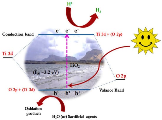 Due to its strong photocatalytic activity, high chemical stability, and the long lifespan of electron–hole pairs, titanium dioxide is one of the most widely used semiconductors for water-splitting photocatalysis. However, various characteristics of titania, including structural defects, crystal phases, particle size, rapid recombination of electron–hole pairs, low surface area, susceptibility to reverse reactions, and the production of water and band gaps, limit its suitability for visible light applications in the water-splitting process [10,11,12,13]. To address these challenges and enhance the efficiency of TiO2, several methods have been explored in recent years. These include loading noble metals such as gold [14], palladium [15], copper [16], and platinum [17], combining TiO2 with other semiconductors [18], modifying the surface of TiO2 particles with absorbers [19], adding colors and contaminating with non-metallic elements [20,21,22], and regenerating of nanotubes [23,24]. Despite these efforts, the challenge of hydrogen production using TiO2-based photoanodes, particularly through structural modification of this material, remains significant for researchers in this field. Recognizing this importance, the present review focuses on some of the most critical topics related to hydrogen production via the water-splitting method using the TiO2 photocatalyst. Figure 1 schematically shows all the topics discussed in this article.