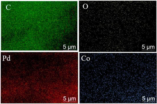 Pd-Co/C elemental mapping diagram; carbon (as green dots), oxygen (as white dots), palladium (as red dots), and cobalt (as blue dots).