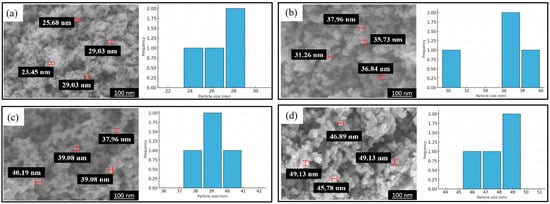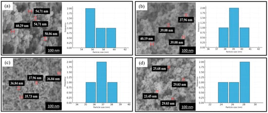In Figure 1 and Table 1, SEM-EDS analysis was performed to verify the successful attachment and uniform elemental distribution of Pd and Co over the carbon black support. The elemental mappings confirm the uniform dispersion of Pd and Co at the surface of the carbon black support. EDS images showed the uniform distribution of Pd (red), Co (blue), O (white), and C (green) and successful synthesis of an efficient catalyst (Figure 1). Additionally, the weight percentage of carbon, palladium, cobalt, and oxygen are 72.97, 15.64, 4.01, and 7.38%, respectively (Table 1). SEM analysis helps in concluding and establishing a proportional relation between annealing temperature and residence time to the particle size. In Figure 2 and Table 2, the average particle size without annealing is 26.8 nm, while the average particle sizes with annealing at 400, 500, and 600 °C are 36.8, 39.1, and 56.9 nm, respectively. The average particles size gets bigger with the increase in annealing temperature. In Figure 3 and Table 3, the average particle size is 65.4, 39.1, 47.7, and 26.8 nm with the different annealing time of 0, 0.5, 1, and 2 h, respectively, at a temperature of 500 °C.
