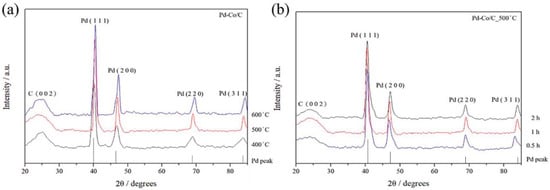 XRD analysis of Pd-Co/C (a) at various annealing temperatures and (b) at different residence time distribution profiles for an annealing temperature of 500 °C.