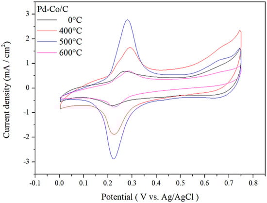Cyclic voltammograms of Pd-Co/C catalyst at various annealing temperature profiles.